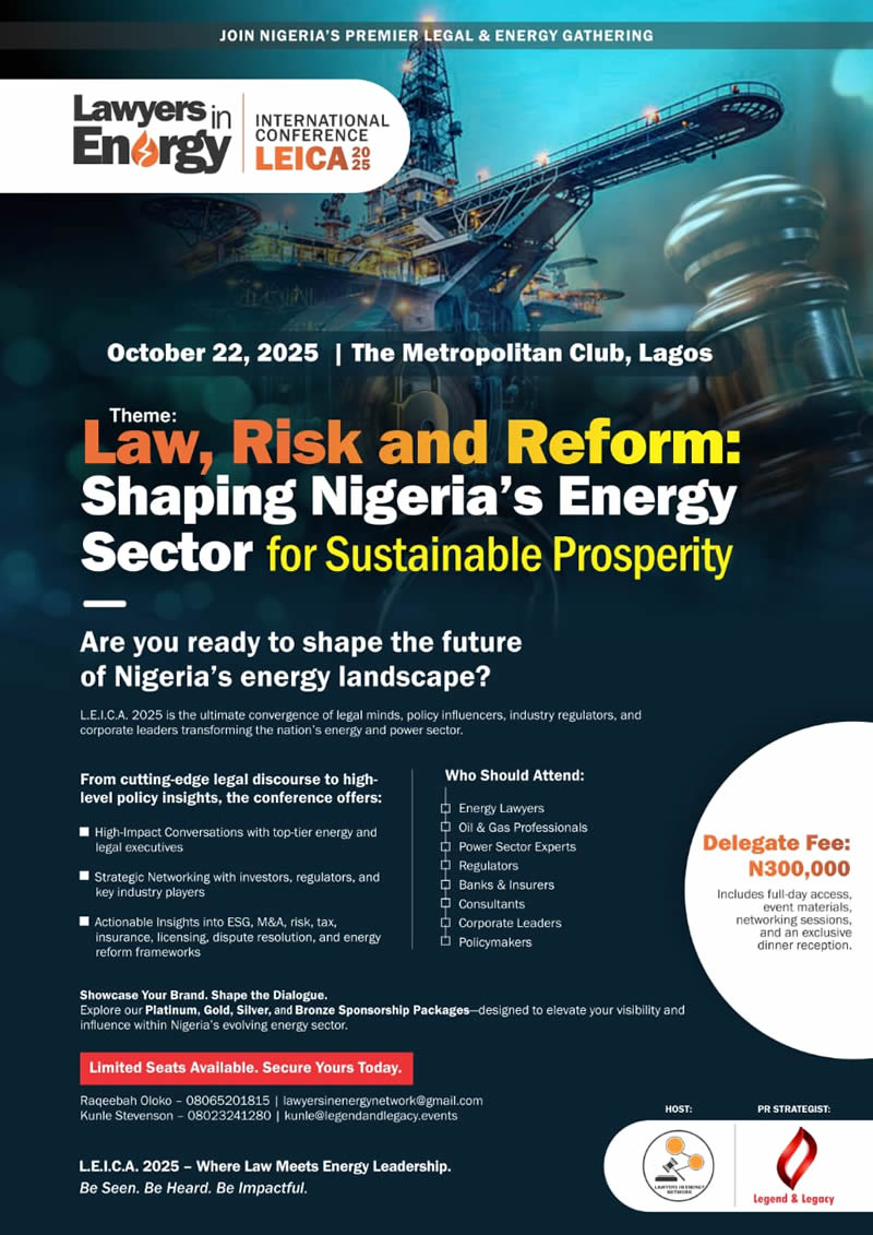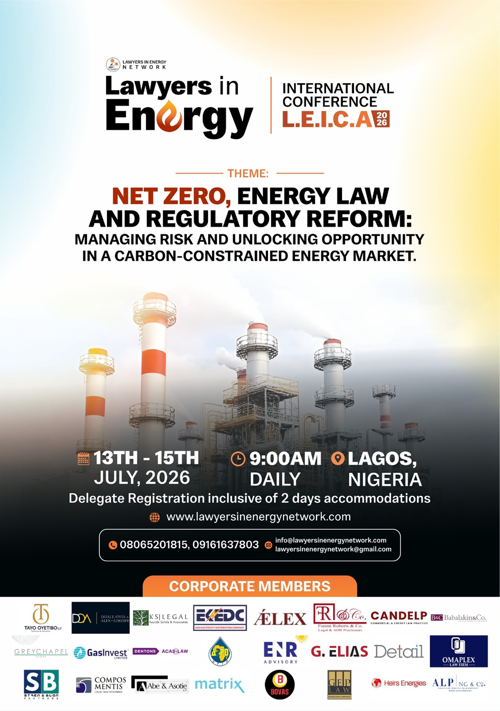 Lawyers in Energy Network is a Non-Governmental Organization, established for the purpose of bringing together Lawyers in the Energy Industry to brainstorm on ways to develop the Legal and Regulatory Framework of the International Energy Industry to enable businesses to continue to thrive. Established in 2015 as Lawyers in Oil and Gas Network, the organization has transitioned into a Centre point and hub of resources for lawyers in the Energy Space.